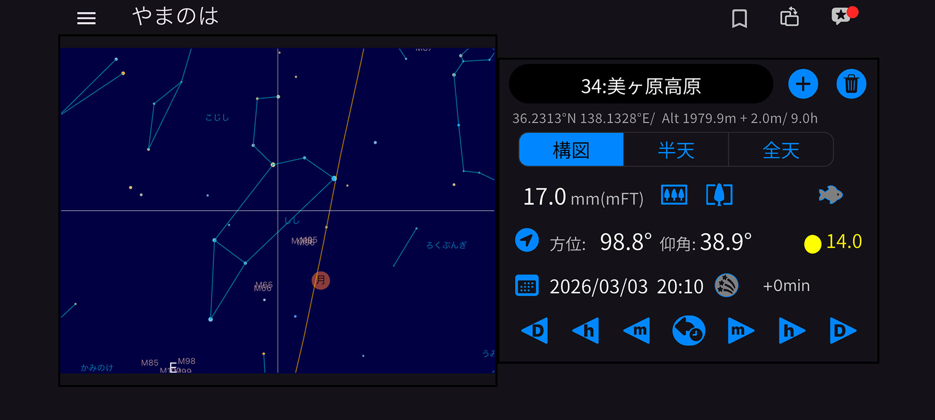 2026年3月3日の皆既月食は、食の最大の頃、月の周囲には春の代表的な星座であるしし座が位置します。以下の図は「やまのは」というアプリを使ってシミュレーションしたものになります。しし座がまるで赤い月を足で蹴り上げているかのようにも見える印象的な配置になるため、標準ズームレンズで周囲の星座と一緒に撮影してみるのもおすすめです。