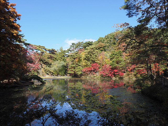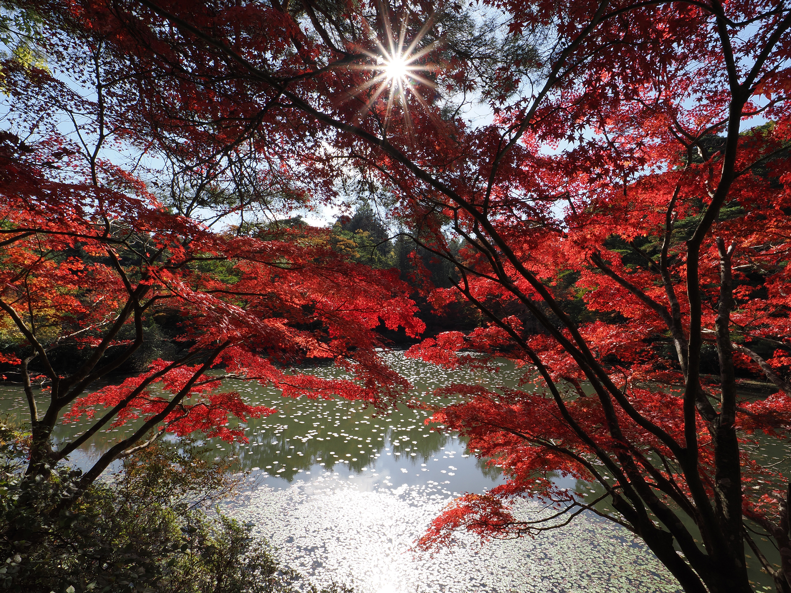 こちらの2枚の写真、1枚目は順光となる位置から池の向こう側、正面の赤いモミジの木を撮影。その後、遊歩道をぐるりと回り込んで反対側の逆光となる場所へ移動して2枚目を撮影しました。同じ紅葉でも葉の色の印象が異なることがおわかりいただけるのではないでしょうか。またせっかく晴れた日だったので逆光時にはF16まで絞り、葉の隙間から光条を出してみました。