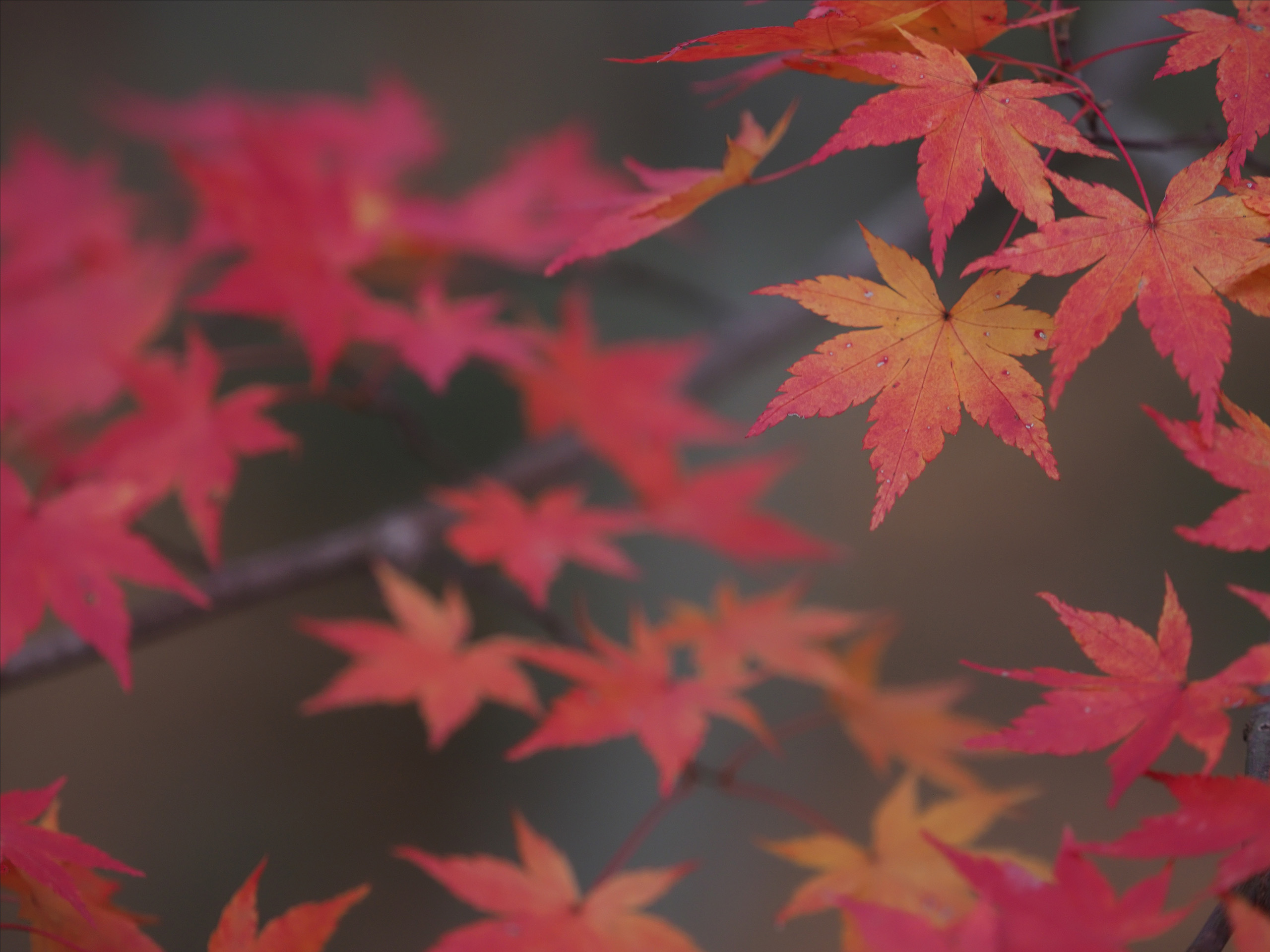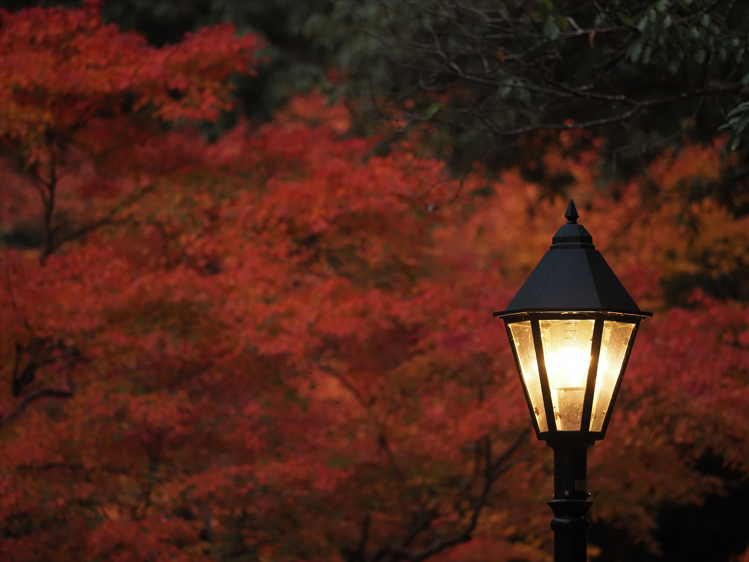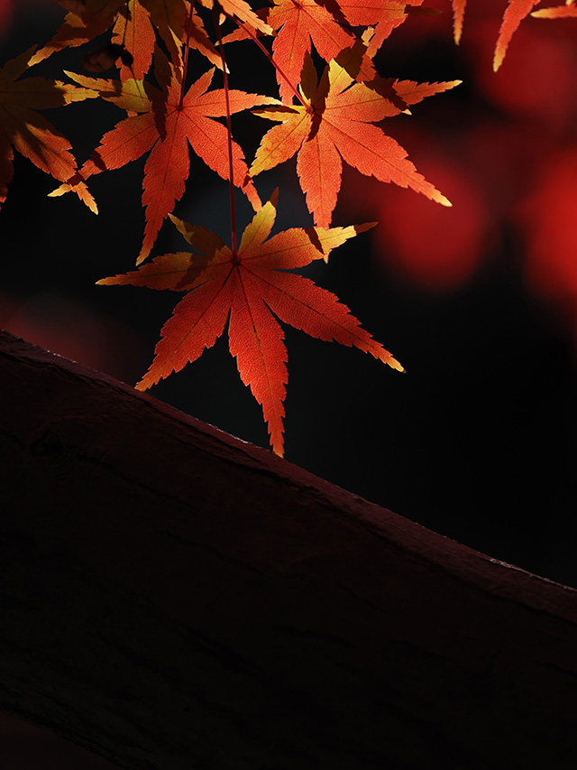 背景が影になる場所でスポットライトのように逆光となる光が当たっている葉を選び、露出をぐんと下げることで暗い(黒い)背景に透き通った印象を残しつつもしっかりと赤い紅葉が浮かび上がる1枚となりました。
