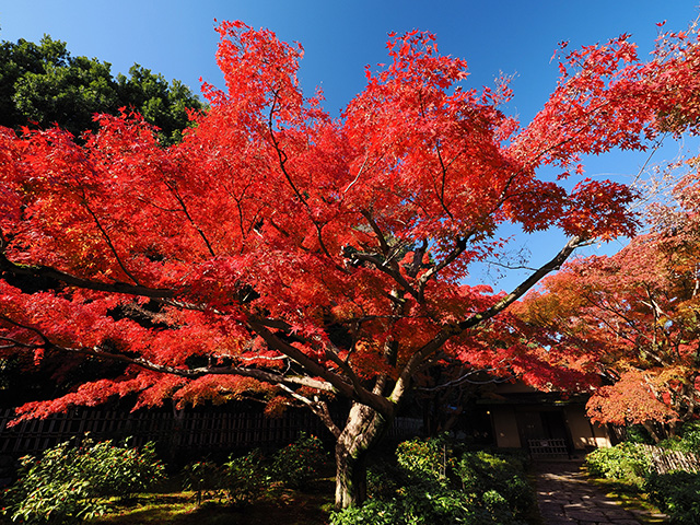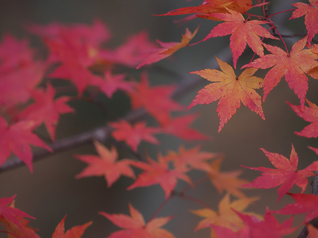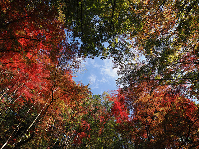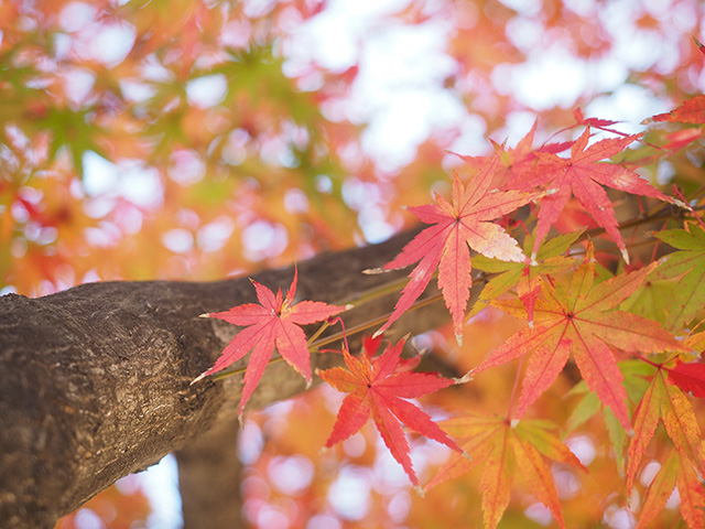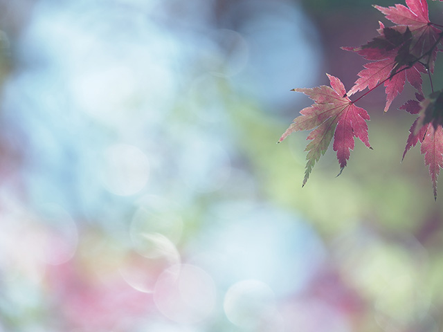 真っ青な空の下、赤やオレンジ色の紅葉が広がるさまは目を楽しませてくれる景観ですが、いざ、葉をクローズアップして撮ろうとすると……あれ?思ったほど綺麗じゃない!そんな経験のある方も多いのではないでしょうか。そんな時はぜひ、葉の表面からではなく、葉の裏側から逆光になる向きにレンズを向けて透過光で撮影してみてください。また、夏の暑さや雨量など、さまざまな要因で色づき具合がイマイチな年もありますが、そんな時でもこの透過光での撮影がおすすめです。