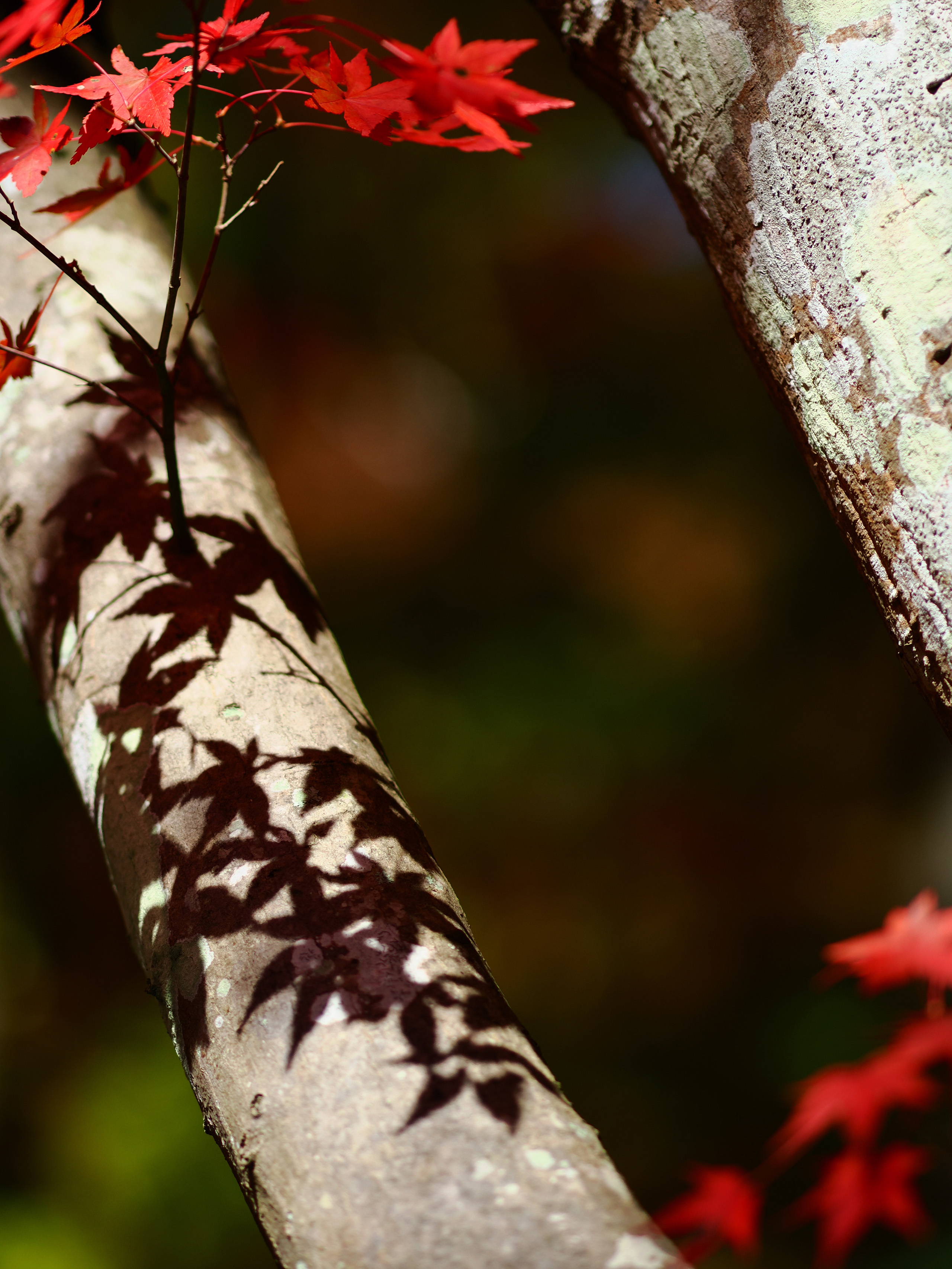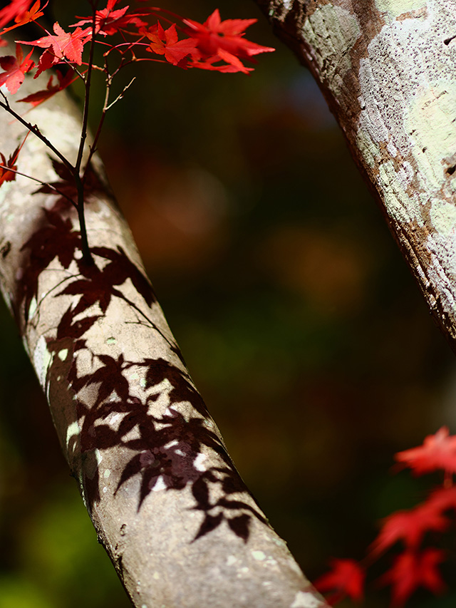 晴れた日の強い光とモミジの可愛らしい形を利用して、敢えて影で紅葉を表現してみました。青モミジではなく赤く色づいた葉であることを伝えるために赤い葉も脇役として画面の端に少し配置しています。