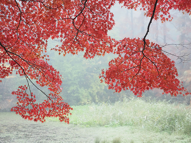 真っ赤に色づいたモミジと、霧で白みがかった緑の背景との対比がとても綺麗でした。露出を上げて全体的に明るい雰囲気に。
