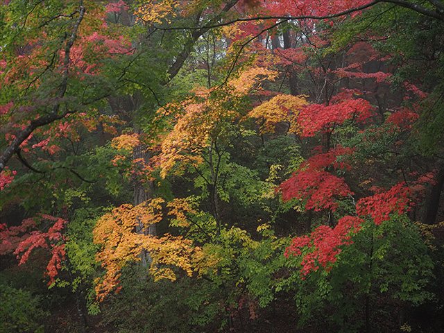 鮮やかな紅葉を目にすると気分も高揚し、目の前の鮮やかな色をそのまま写真で再現したくなるのは自然な心理だと思います。そこでカメラの設定も「Vivid」にした結果……「何か違う」と違和感を覚える方も多いように思います。被写体自体にしっかり色がある場合はむしろ「Natural」で十分その発色が伝わることも多く、Vividにすることで色の彩度が高くなり過ぎ、絵の具をベタっと塗ったような仕上がりとなって違和感を覚えたり、見ていて疲れる写真になってしまったりします。逆に紅葉の色付きがイマイチだなと感じる場合や、雨で霧が掛かっているような場合にVividで「少し色を盛る(強調する)」、そんな使い方がオススメです。(上記「雨の日」参照)