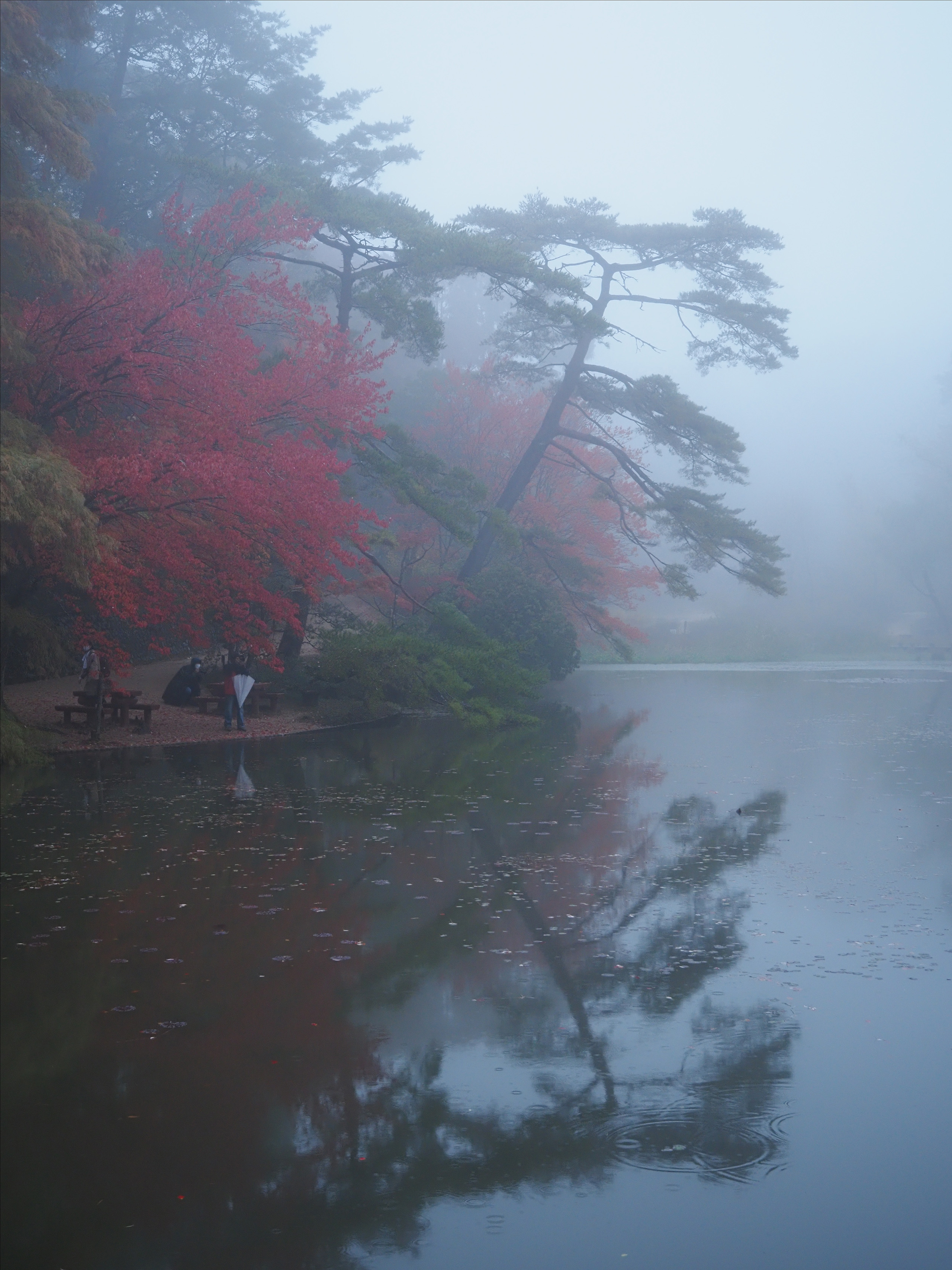 池への写り込みを意識して撮った1枚ですが、霧というフィルター越しのため、ピクチャーモードはVividにして赤色を強調しました。