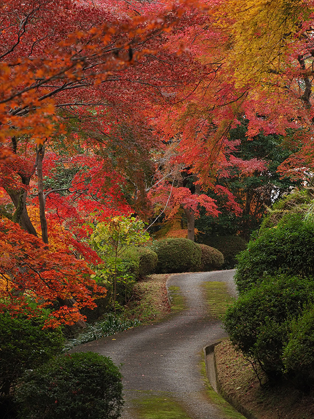 望遠レンズのもうひとつの大きな特徴に「圧縮効果」があります。遠近感が縮まってぎゅっと詰まった印象となるものですが、これにより画面いっぱいに紅葉が詰まった印象の写真とすることができるため、並木道など奥行きのある場面で有効活用したい効果です。