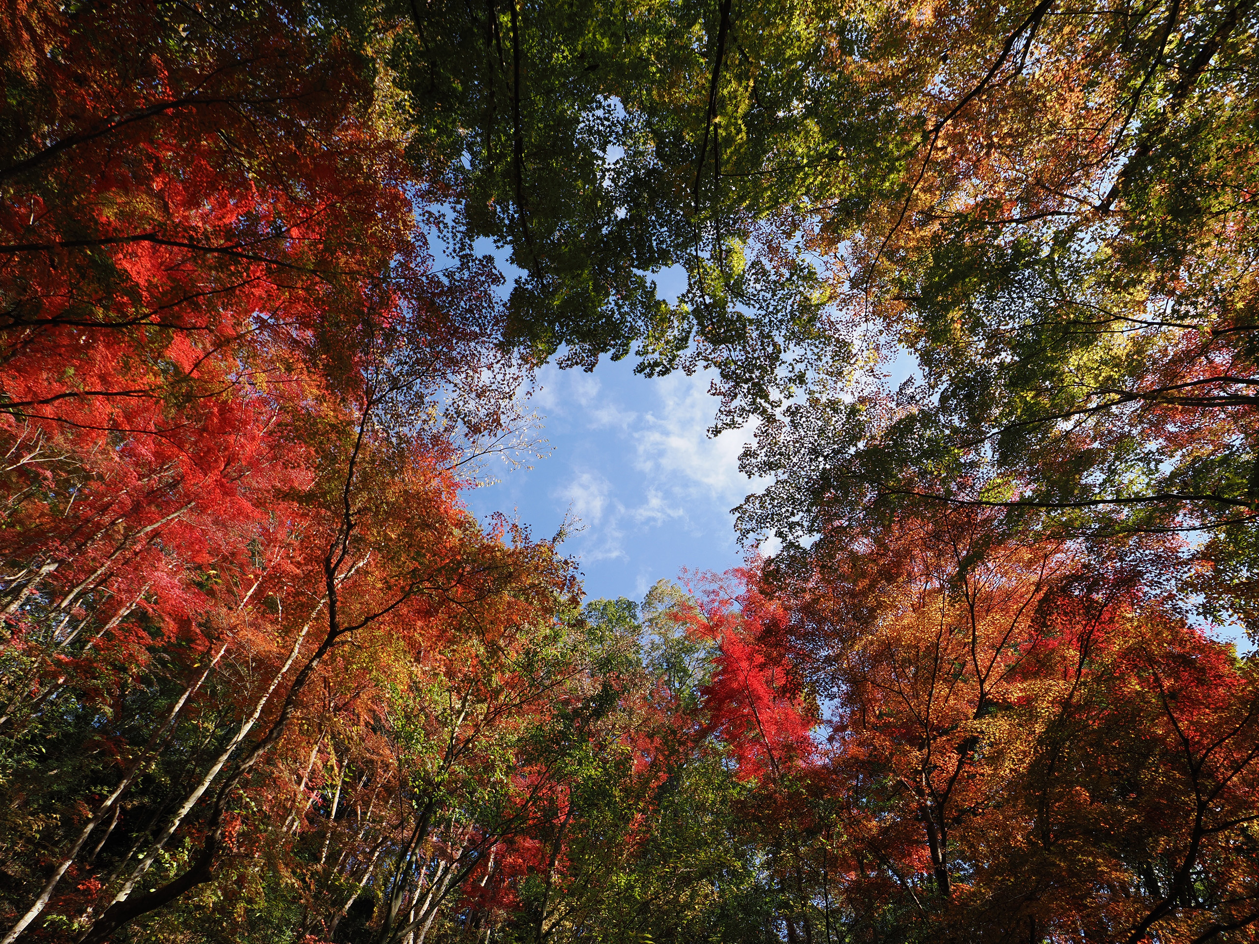 なかなか使いどころが難しいクロスプロセスですが、紅葉との相性は悪くないように思います。背景が緑になるあたり、多少シチュエーションを選ぶ場面もあるため好みが分かれるとは思いますが、背景の緑が赤や黄色の葉を引き立ててくれるので、ぜひ試してみていただきたい設定です。ここでも通常撮影からクロスプロセスに変更した後、更にホワイトバランスを下げるために「蛍光灯」を選択することで、全体の黄色っぽさを減らしています。