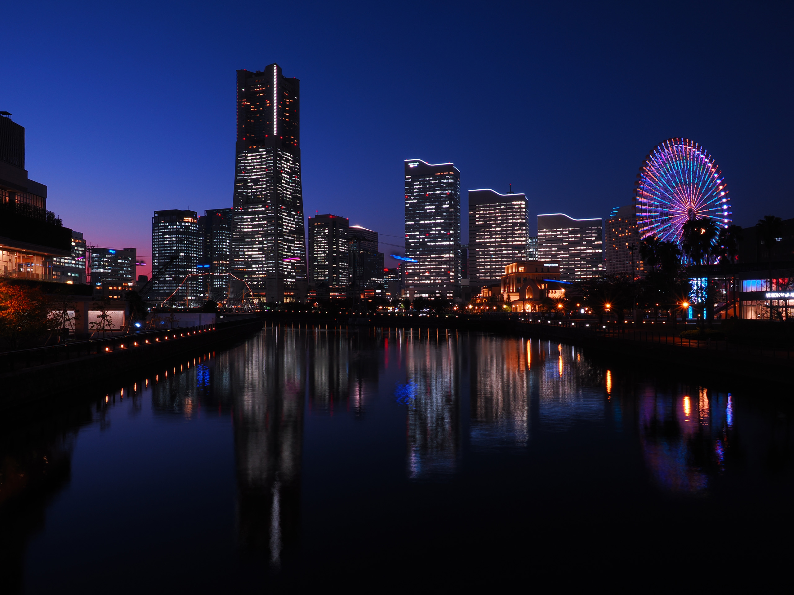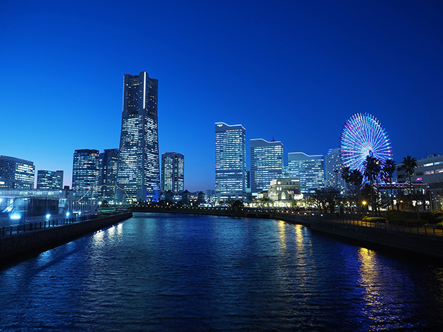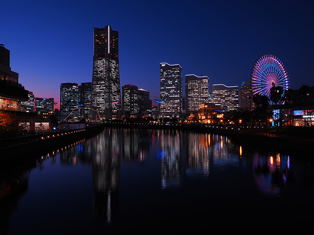 日没から約30分後の撮影。空のトーンも残り、夜景も目立つベストタイム。日没から約20分後だと、空が明るくて、夜景がまだ目立たず、日没から約40分後だと、夜景は目立つが、空が暗い。
