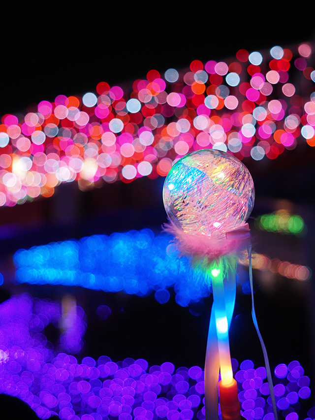標準ズームレンズが一本あればいろいろな撮影ができますが、シーンに合わせて広角ズーム、望遠ズームなど豊富な交換レンズで撮影の幅を広げることができます。単焦点レンズはズームができませんが、いずれのレンズも絞りの開放値が明るいので、背景を大きくぼかしたり、暗所でも速いシャッター速度が得られたりというメリットがあります。イルミネーションをぼかすにはぴったりですね。