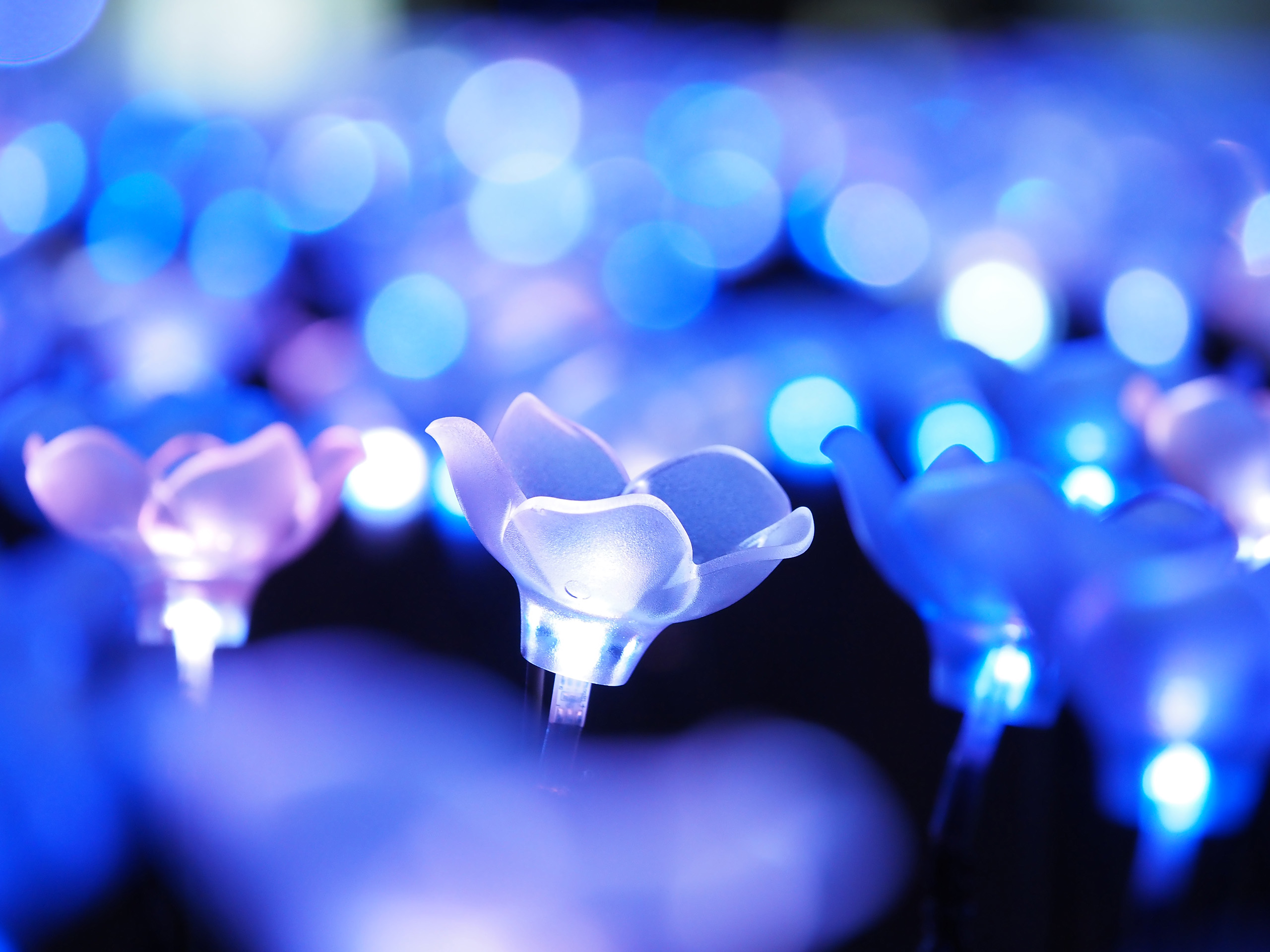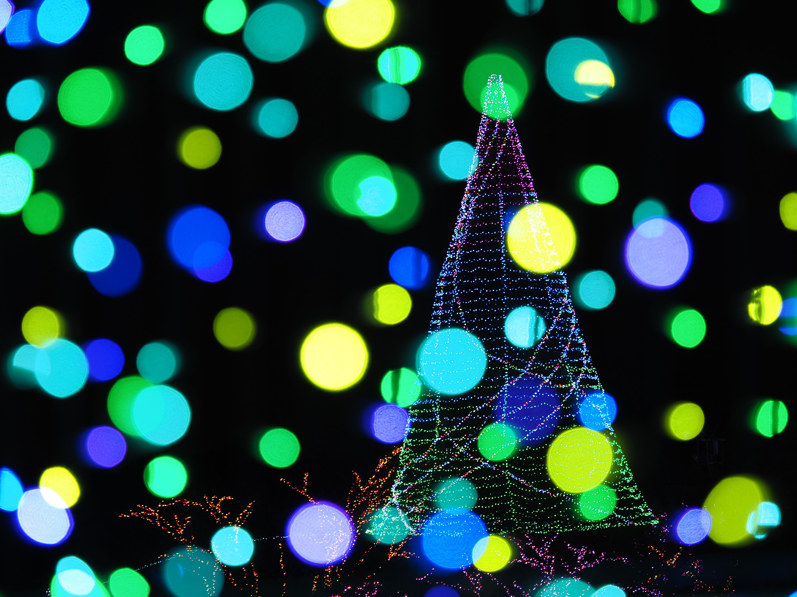 光が雪のように浮かんでいるようです。前ボケを作るには主役より前側にイルミネーションがある必要があります。ここでは奥のツリーにピントを合わせ、手前のイルミネーションをぼかしています。コードが写ってしまいそうですが、大きくボケているのと、黒っぽい色なので目立ちません。
