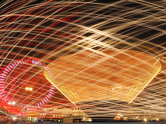 夜の遊園地は被写体の宝庫。複雑な動きをする乗り物たちの光の軌跡を写しましょう。人が乗る部分がそれぞれ上下運動しながら全体的に回転する乗り物。暗く、動きが速いので乗り物自体は写りませんが、明るい光の軌跡だけが写って不思議な造形を描き出しています。