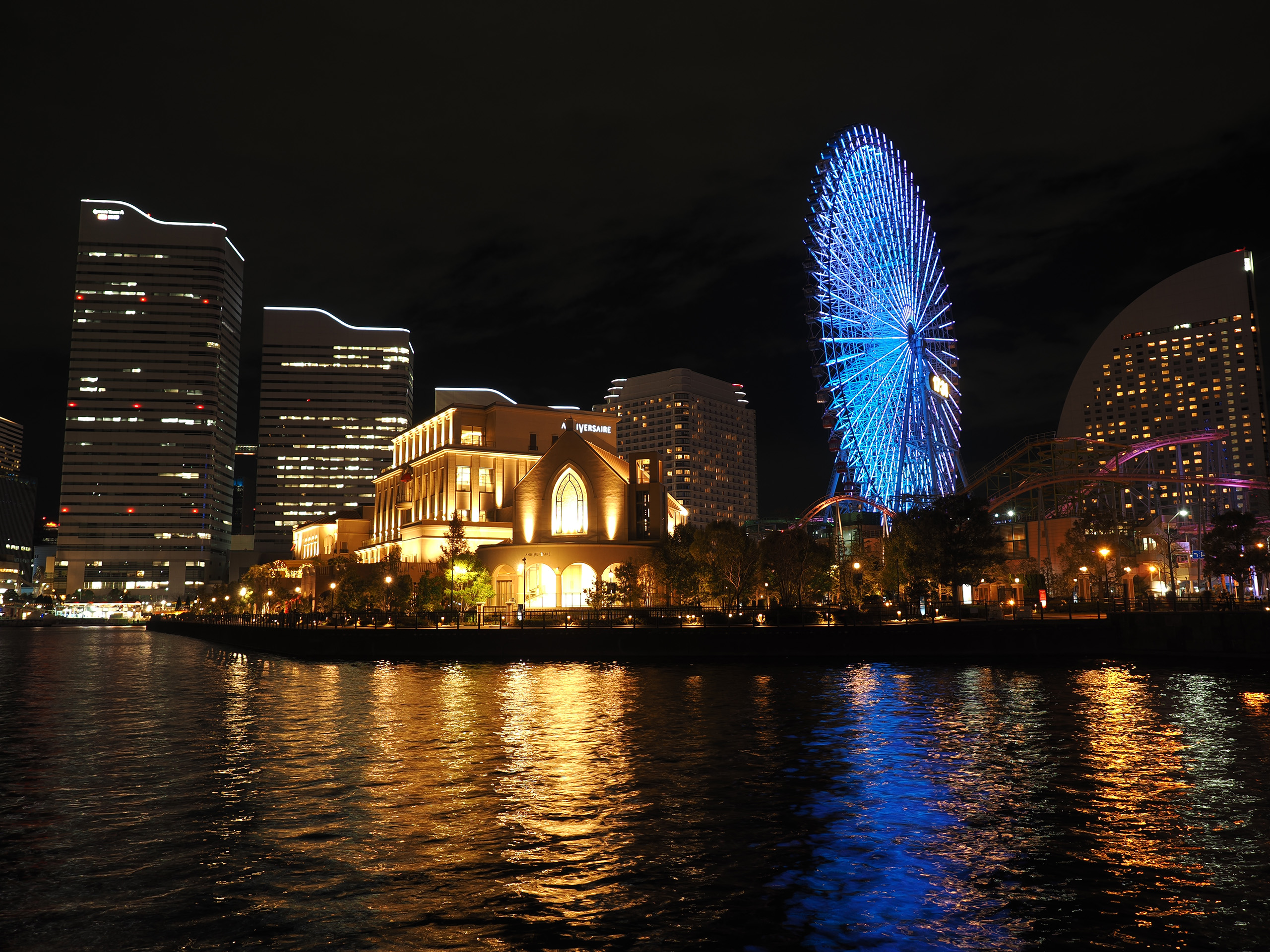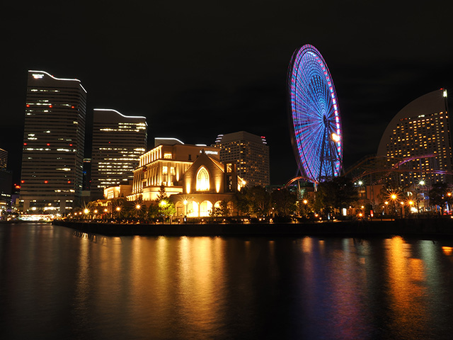 運河に浮かぶ美しい建物。0.5秒では水面はさざ波立って見えますが、30秒のスローシャッターになると波と波が重なり合って陰影がなくなり、穏やかな水面に感じられます。また黒い部分が消えるので、映り込みもより明るく感じられますね。ゆっくりと動く観覧車も30秒もあれば回転している様子が出てきます。