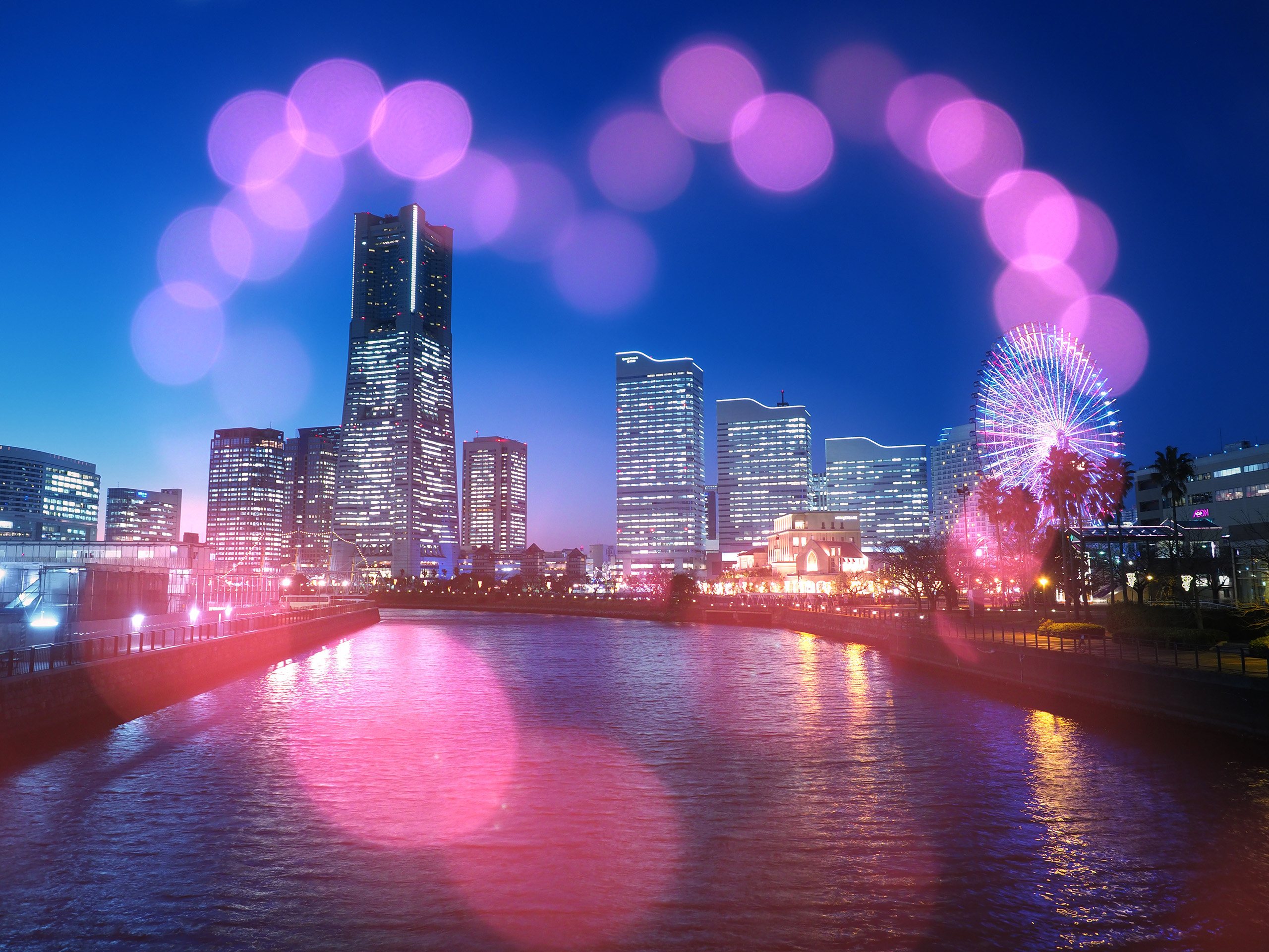 全く別のシーンにボケ画像を重ねるのもおすすめです。夜景の画像にハート型のイルミネーションをぼかした画像を重ねました。シャープな画像同士を重ねるのは難しいので、シャープな画像とボケ画像を重ねる方法からスタートしてみましょう。