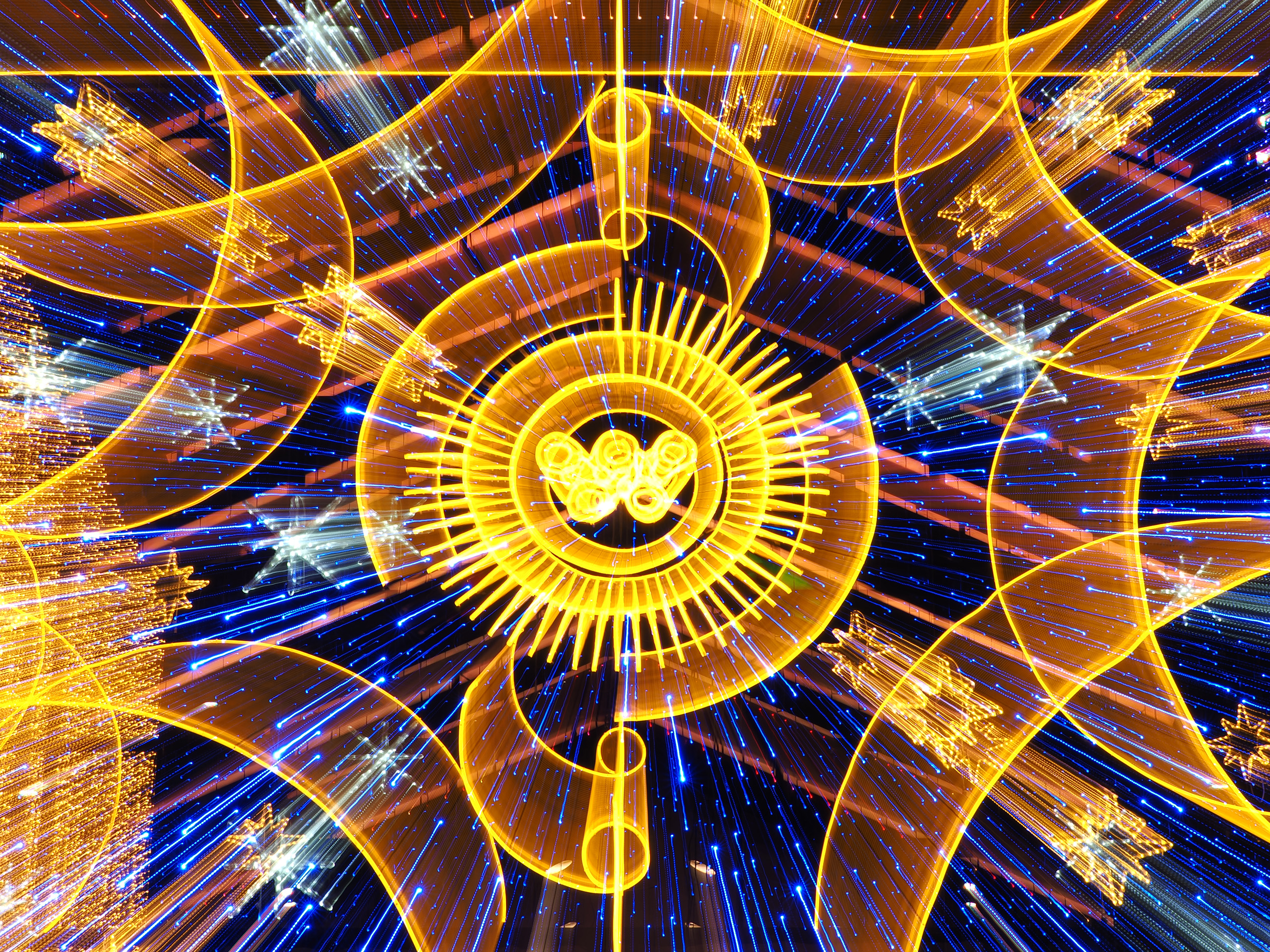 画像が飛び出したように写る「露光間ズーム」。シャッターを開いている間にズームリングを動かして画角を変化させることで、光の軌跡が放射状になって写ります。ズームを動かすという操作ができる程度のシャッター速度を選ぶ必要があるので、速くても2秒くらいに設定しましょう。広角から望遠、望遠から広角のどちらでも構いませんが、望遠側の画角でとどまる時間が長めになると光が中心から外へ放出したように写ります。