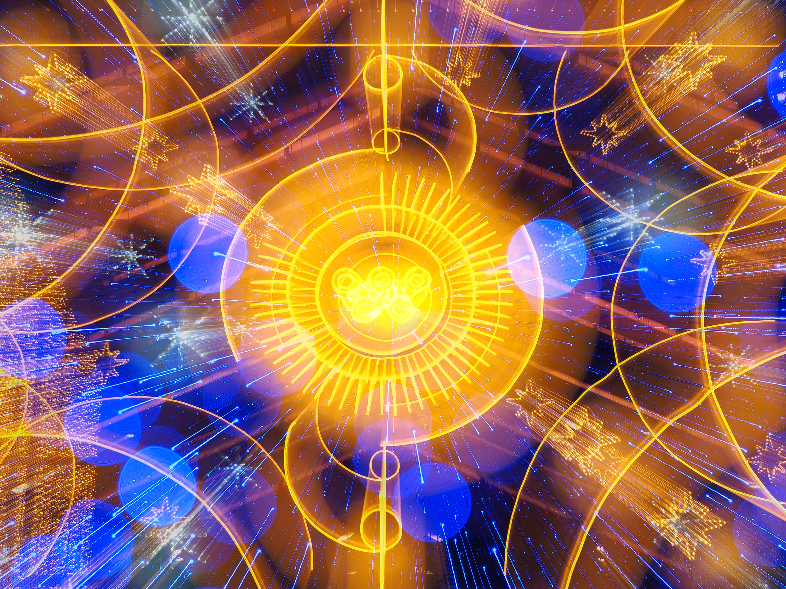 まずは画角変化を利用した露光間ズームで飛び出したような画像を作ります。その画像に多重露出、または画像合成でボケ画像を重ねると、宇宙空間のような輝きと動きのある写真になります。