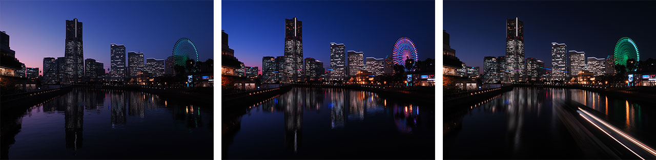 夜景は真っ暗になってから撮影するというイメージがありますが、真っ暗になる前の時間におすすめのベストタイムがあります。それが日没からおおよそ30分後。日没時はまだ空が明るいので夜景は目立ちませんが、次第に空が暗くなり街の明かりが目立っていきます。それでいて空はまだ真っ黒ではなくトーンを残しています。これが日没から約30分後のベストタイムです。さらに空は黒くなり、日没から1時間後には空は完全に黒になります。日没から真っ暗になる間のわずかな時間が夜景撮影のベストタイム。数分ごとに様子が刻々と変わっていくので一日に一度しかないチャンスを逃さず捉えましょう。