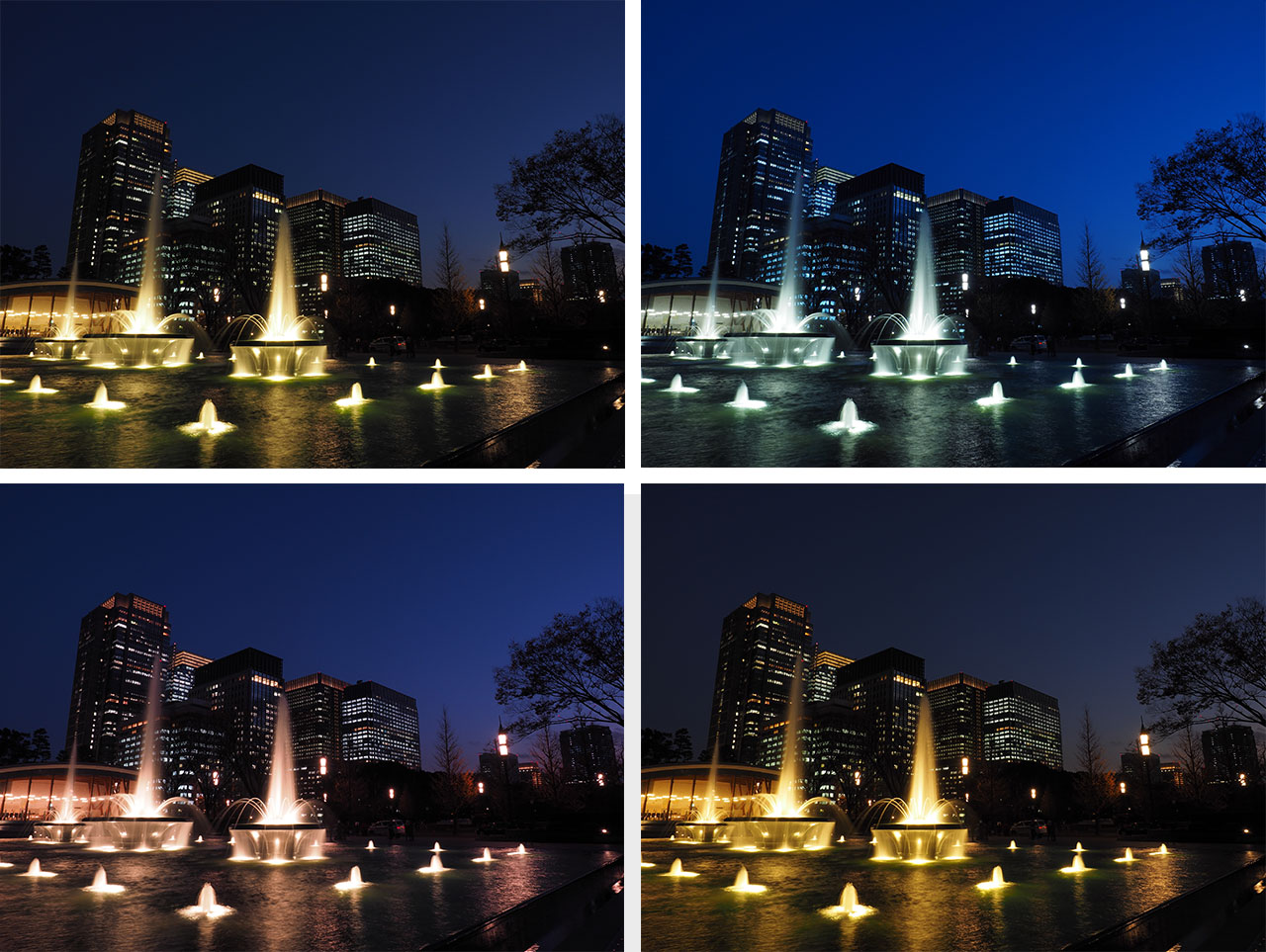 イルミネーションの光を表現するにはホワイトバランス(以下WB)の設定が重要です。ホワイトバランスとはさまざまな光源のもとでも白い被写体を白く写すための機能です。ホワイトバランスを変えて撮影した4枚の写真を見比べてみましょう。画像左上のAWB(オートホワイトバランス)での撮影では、自動で光の色を補正するのでビルの窓の色が白色に写されていますね。しかし、画像右下のWB晴天で撮影したほうが実際の色に近いのです。色の補正がかからないモードなので、夜景の色をそのままに再現したい場合はWB晴天を使います。また色を加えるフィルターとしてWB電球は青くなる、WB蛍光灯は赤紫色になるというのを知っておくと違ったイメージに仕上げる楽しさが出てきますよ。
