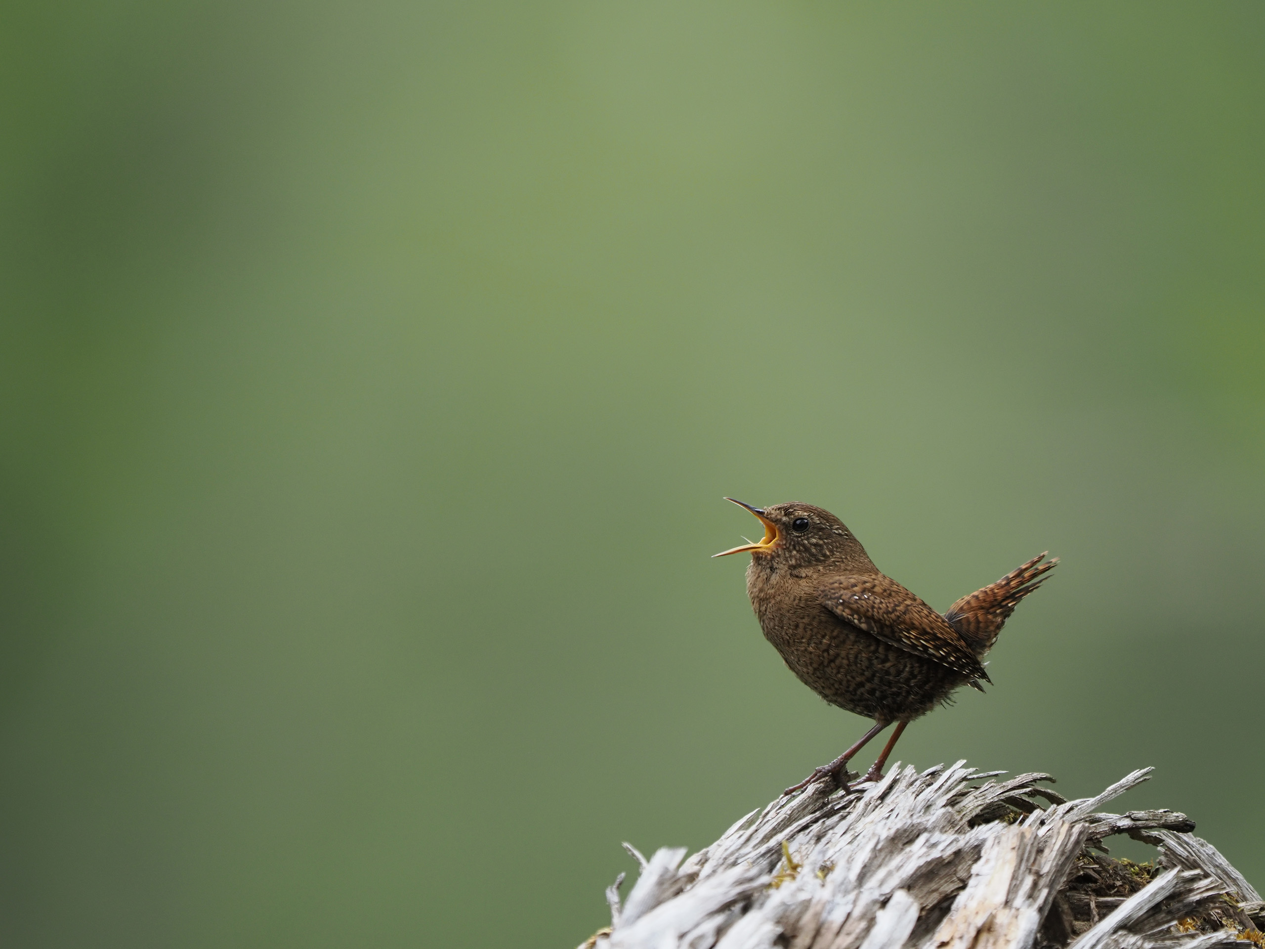 林内の倒木でさえずるミソサザイ。日本最小クラスの鳥も、1000mm相当で撮影すれば驚かさずに理想的な大きさに撮影できる。超望遠レンズは画角が狭いため、背景を整理しやすいメリットがある。