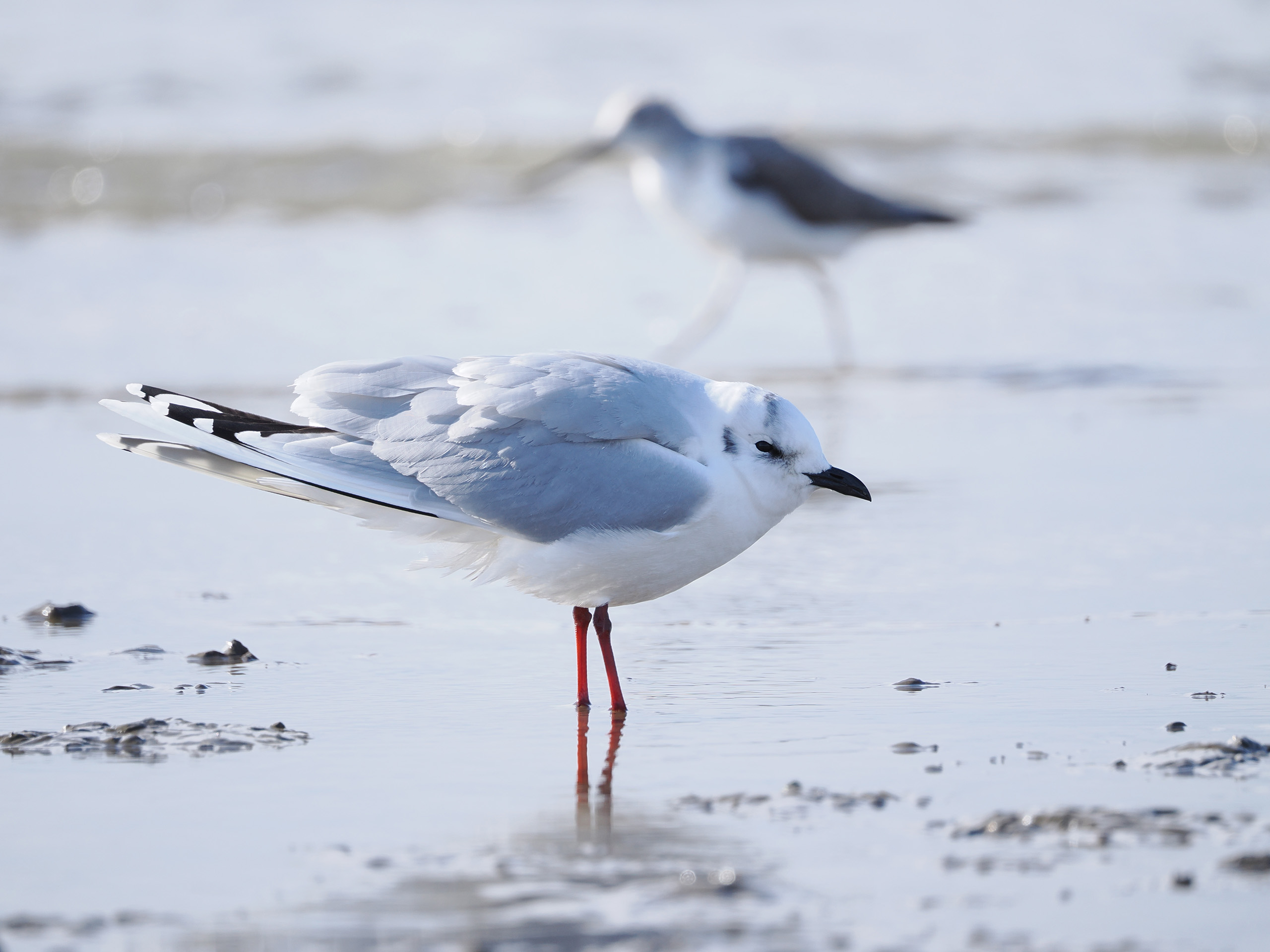 干潟に休むズグロカモメを撮影していると、後方をアオアシシギが通過していった。実際には、2羽の間には10mほど距離があるが、超望遠レンズの圧縮効果で互いが近くにいるように写った。