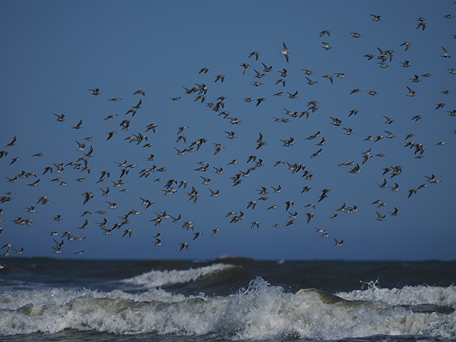 波打ち際を飛ぶミユビシギの群れ。被写界深度が深いため、F値は開放絞りだが、鳥と波の両方にピントが合っている。写り込む背景も広くなるので、群れの形に加え、波頭や水平線の高さなどにも気を配って撮影した。