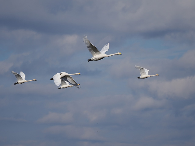 コハクチョウの群れが近づいてきたので、ズームを広角側へ引いて撮影した。画角が広いため、雲の様子も広く写っている。同じ大きさになるように望遠端で撮影すると、背景がより単純化される。