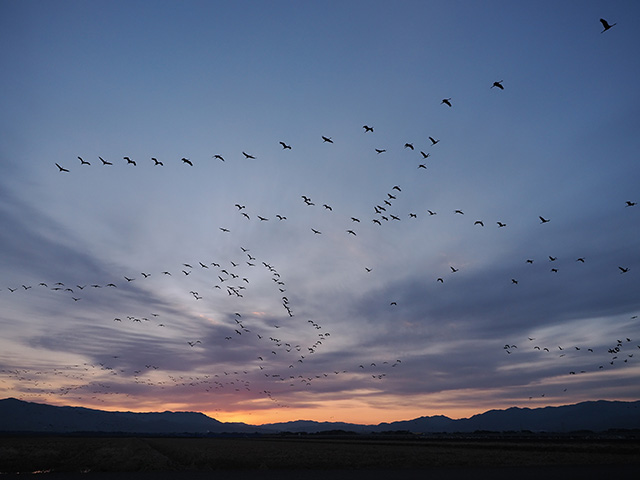 さらに広く写すためには、広角レンズを使用する方法もあります。特に、鳥が大型な場合や、群れの規模が大きい時には、広々とした画角で生息環境を加えつつ、全体を写すことが効果的なことがあります。ガン類やツル類など、薄暮の時間帯に飛び立つ鳥も多いので、そのような鳥たちを写すのであれば、同じ焦点距離でもより明るいレンズが重宝するでしょう。