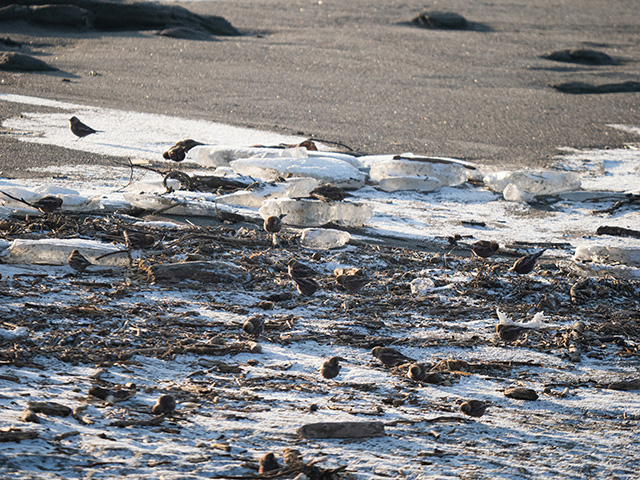 美しいジュエリーアイスと呼ばれる氷が砂浜に打ちあがった。しかし残念ながら、ハギマシコたちは綺麗な氷の場所には、なかなか行かない。なぜなら、綺麗な氷だけが打ちあがった場所には、食べ物が打ちあがっていない場合が多いからだ。枝や、海藻などが沢山打ちあがった場所に食べ物がある。氷が打ちあがるタイミング、ハギマシコの動き、太陽の位置、風向きなど変化する条件の中で、自分がどんな写真を撮りたいのかイメージしてみよう。