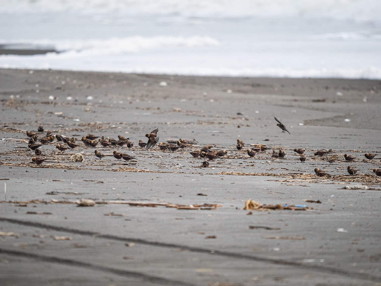 海岸に自生する野草の種子や、海に打ちあがる種子などを食べながら移動しているため、海岸に小鳥の群れが飛んでいないかを、くまなく探すのだ。