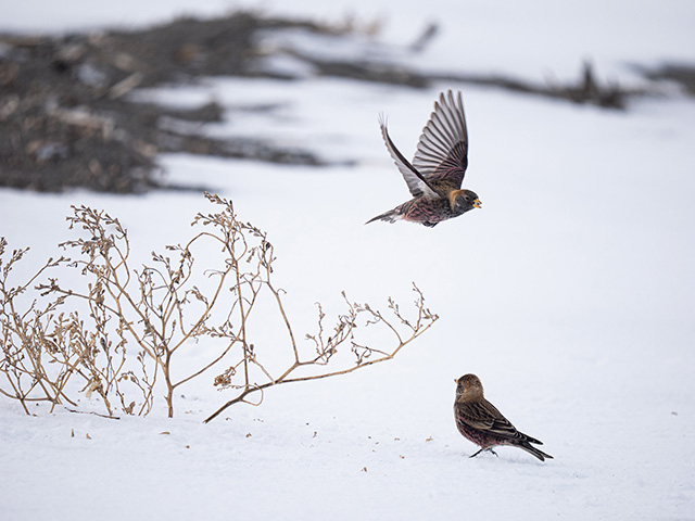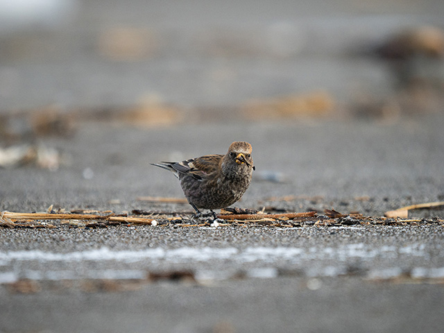 数百羽のハギマシコの群れに混ざって行動していたユキホオジロ。