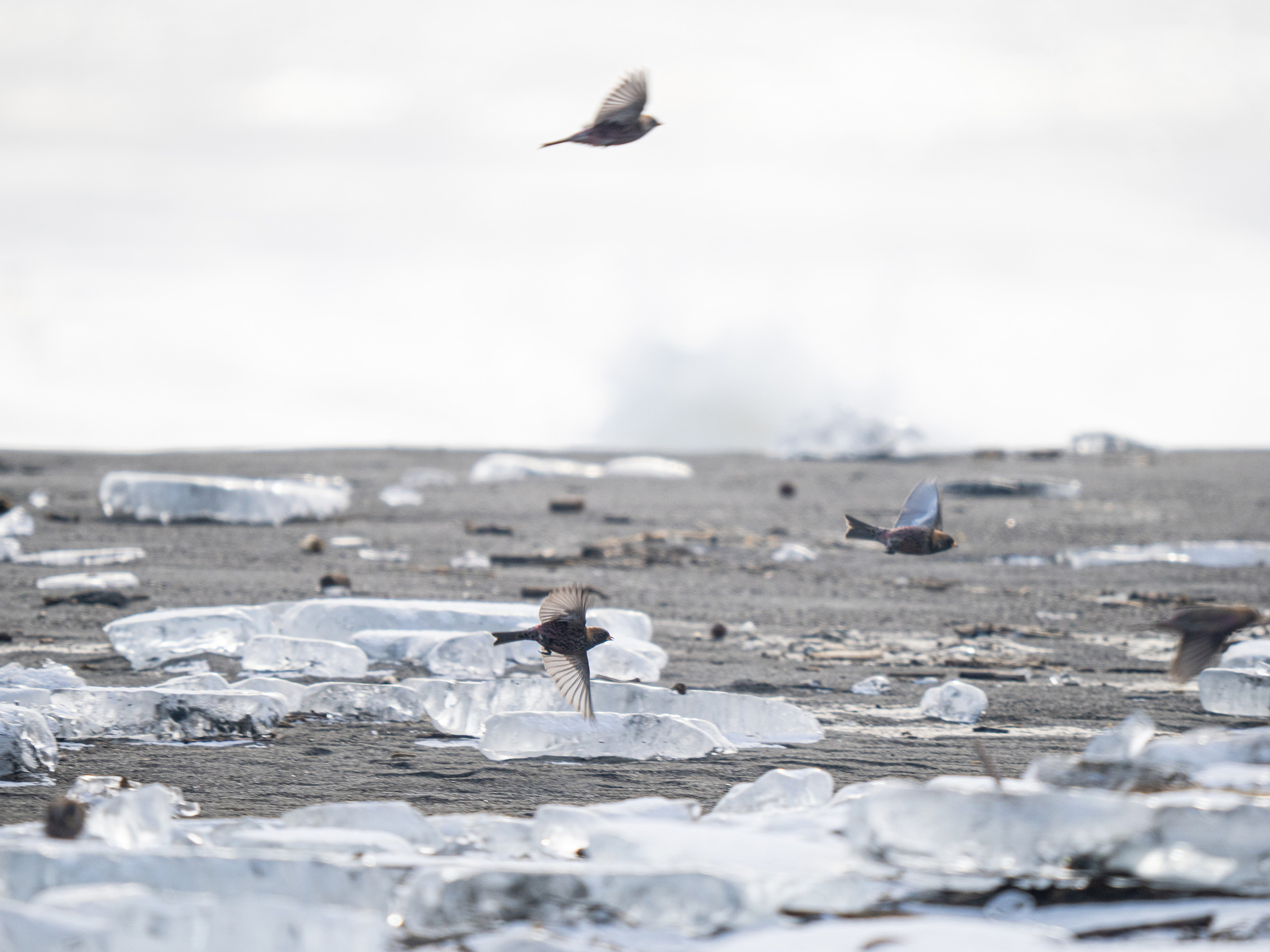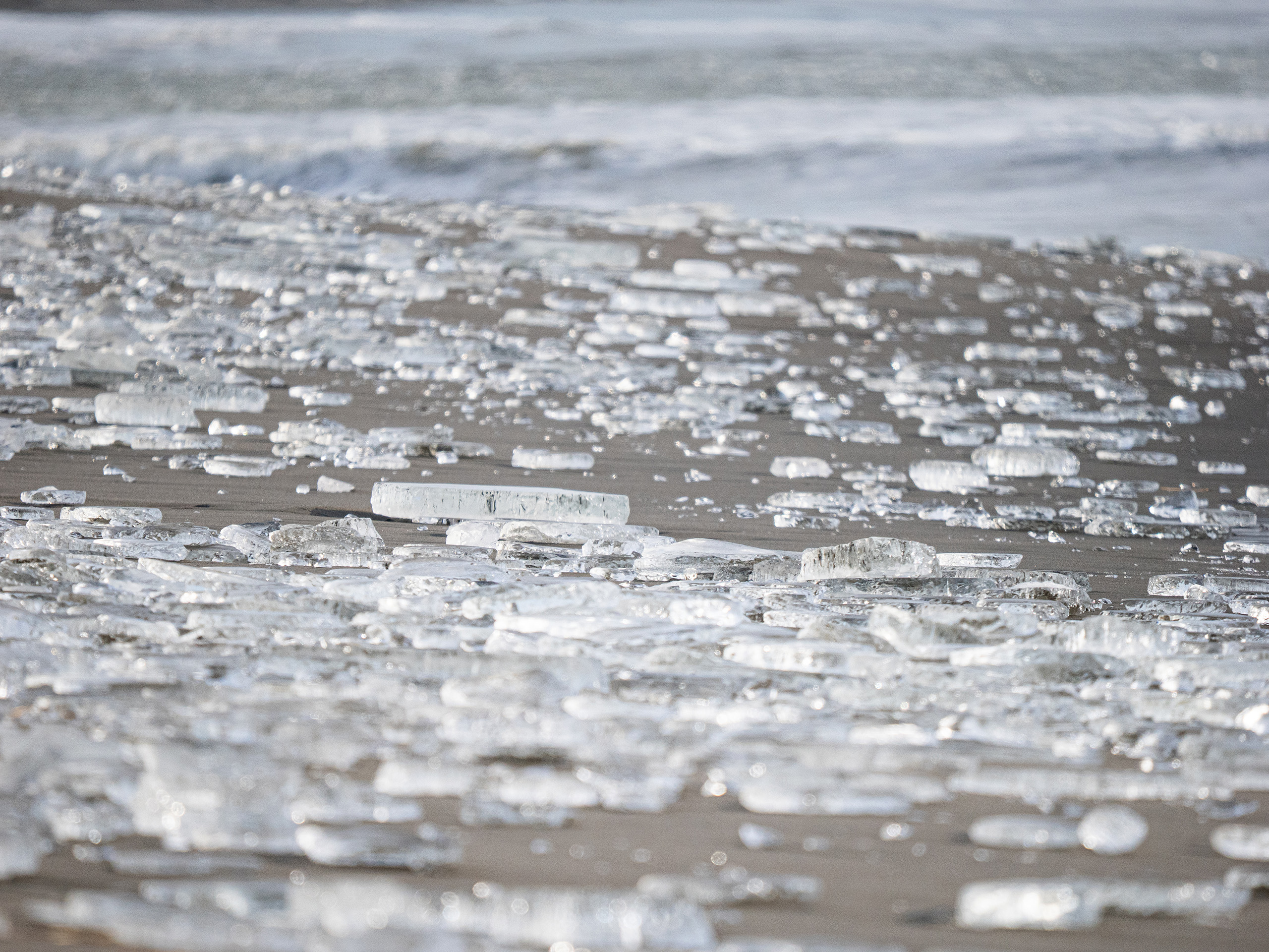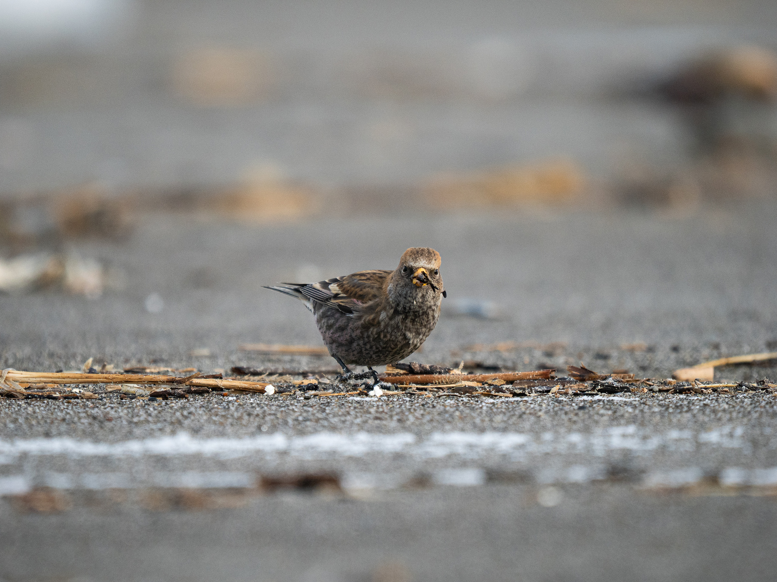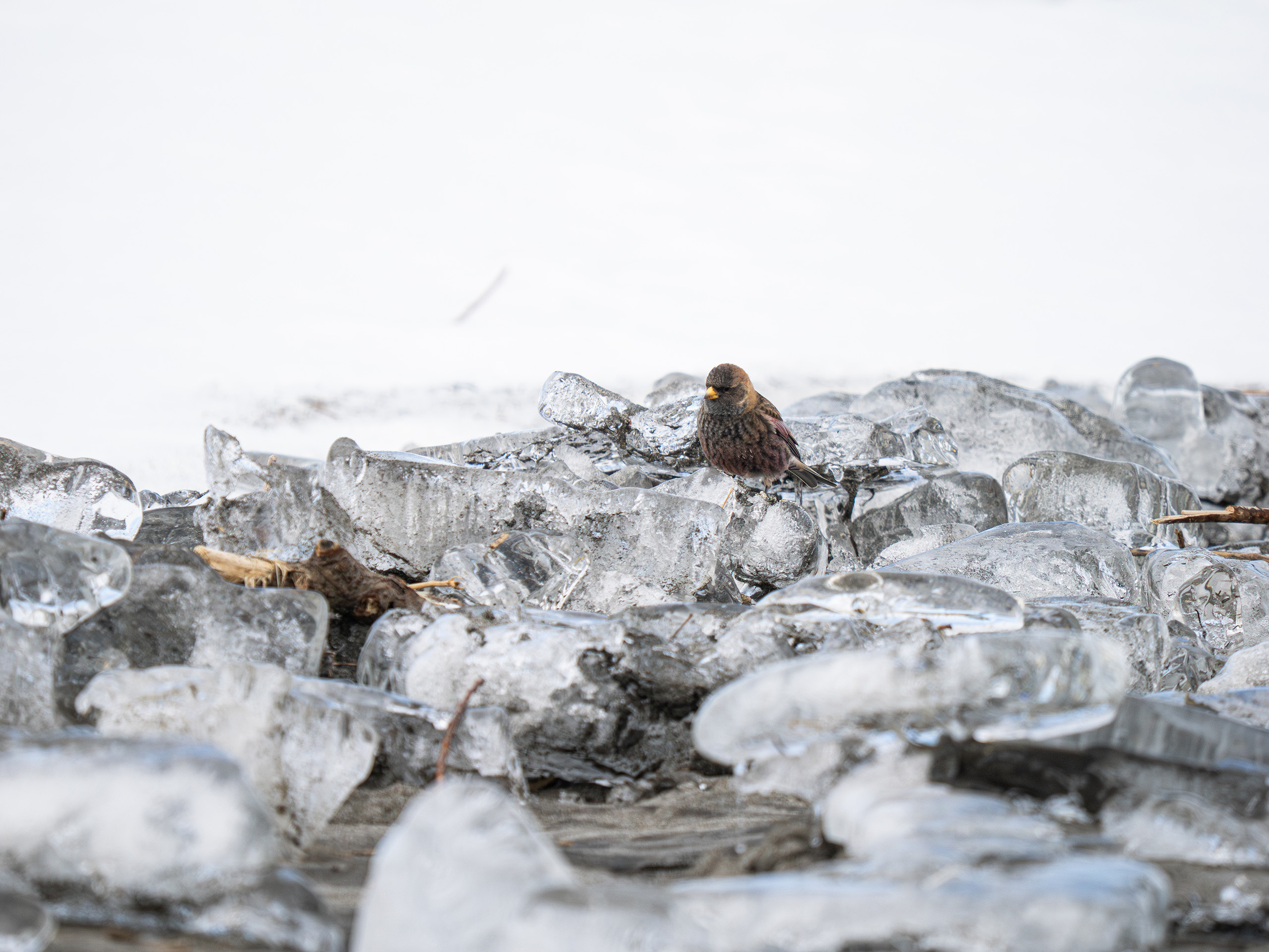 美しいジュエリーアイスと呼ばれる氷が砂浜に打ちあがった。しかし残念ながら、ハギマシコたちは綺麗な氷の場所には、なかなか行かない。なぜなら、綺麗な氷だけが打ちあがった場所には、食べ物が打ちあがっていない場合が多いからだ。枝や、海藻などが沢山打ちあがった場所に食べ物がある。氷が打ちあがるタイミング、ハギマシコの動き、太陽の位置、風向きなど変化する条件の中で、自分がどんな写真を撮りたいのかイメージしてみよう。