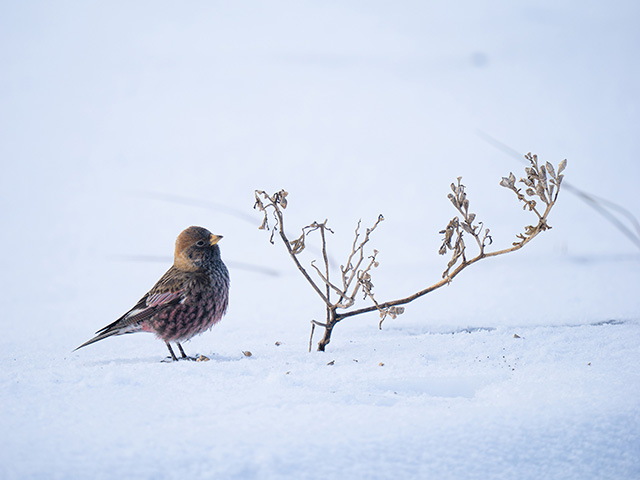 私が暮らす北海道留萌地方は、北海道有数の豪雪地帯で、厳冬期は越冬する小鳥の飛来は少ない。餌となる植物の種子などが雪の下に埋もれてしまうため、雪の少ない地域に飛来するためだろう。