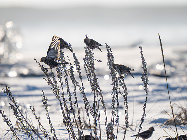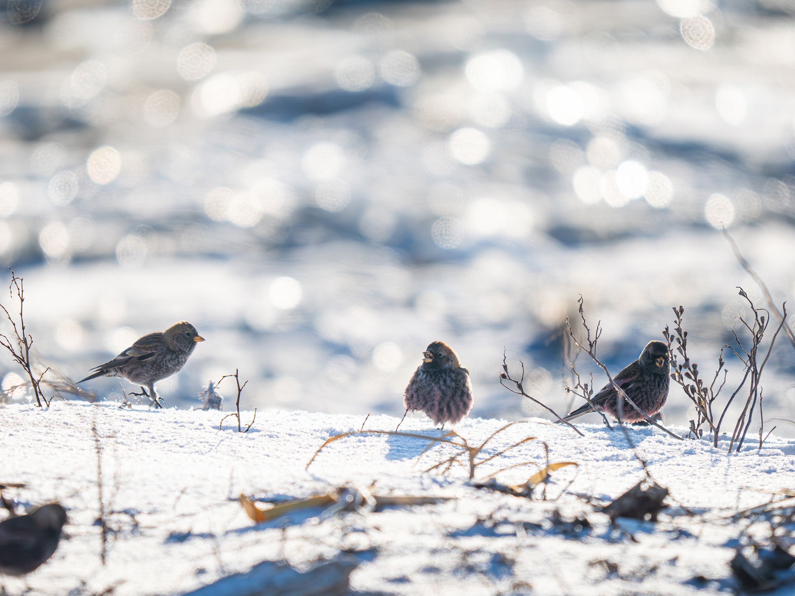 ハギマシコが餌を探す、傑作写真を狙う私、背後には輝く氷の宝石。