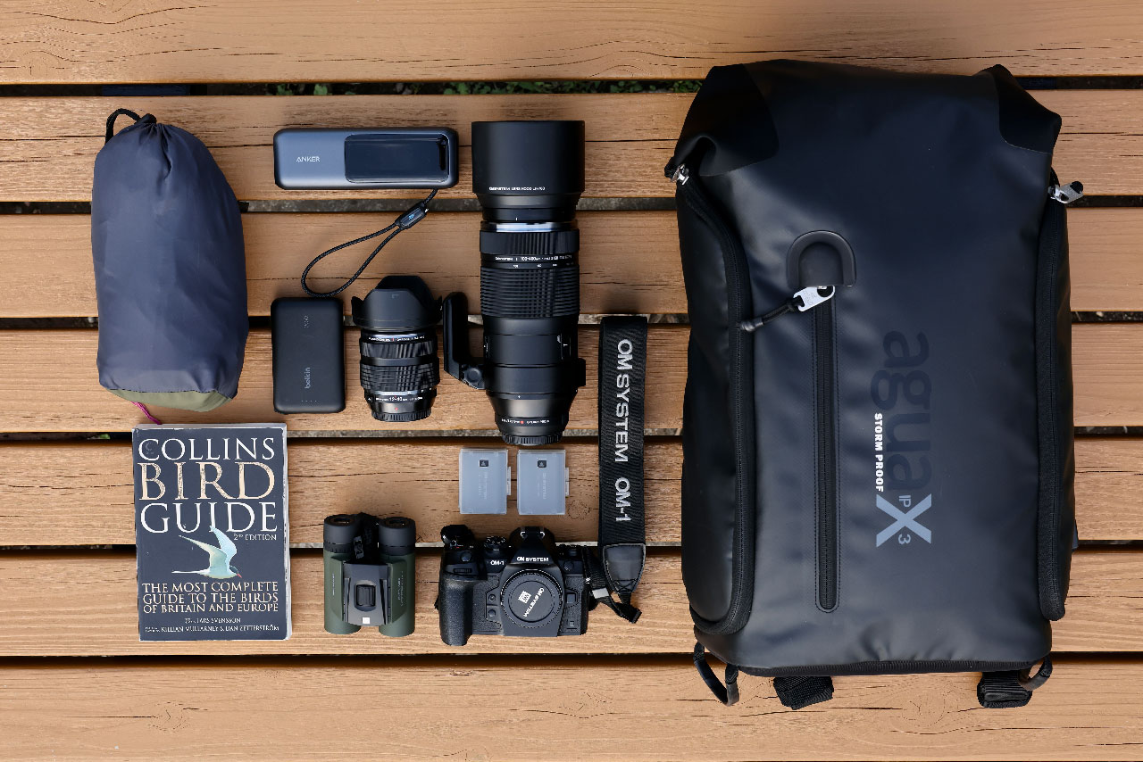 ザックには、双眼鏡とカメラ一式に加え、サブレンズや予備バッテリー、モバイルバッテリー、機内で予習したい鳥の図鑑、上着などを入れています。ザック自体は防水性のあるものを選ぶと、そのまま現地での行動用としても使えます。