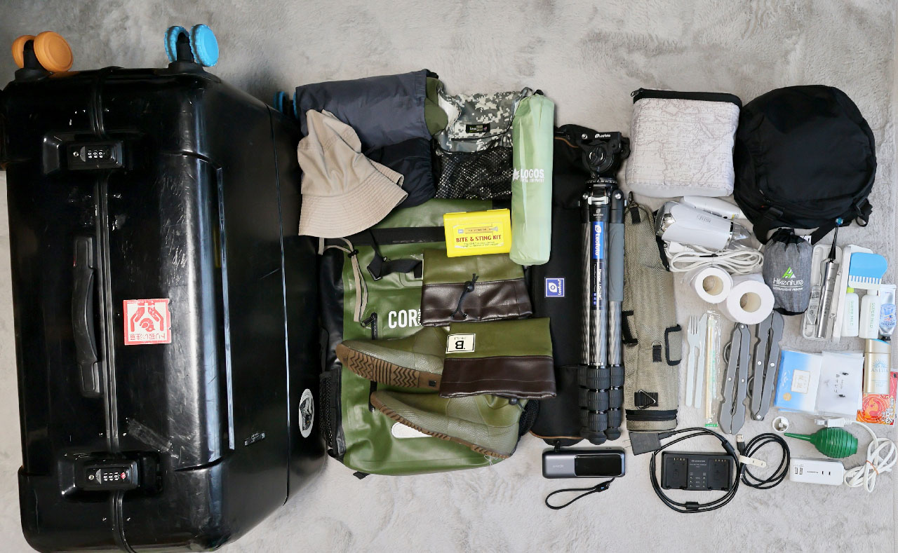三脚、フィールドスコープ、長靴、帽子*、ポイズンリムーバー*、チックツイスター*、レインコート上下*、インフレータブル座布団*、日焼け止め*、トイレットペーパー*、充電器類、ドライヤー、カトラリーなどを入れています。