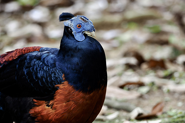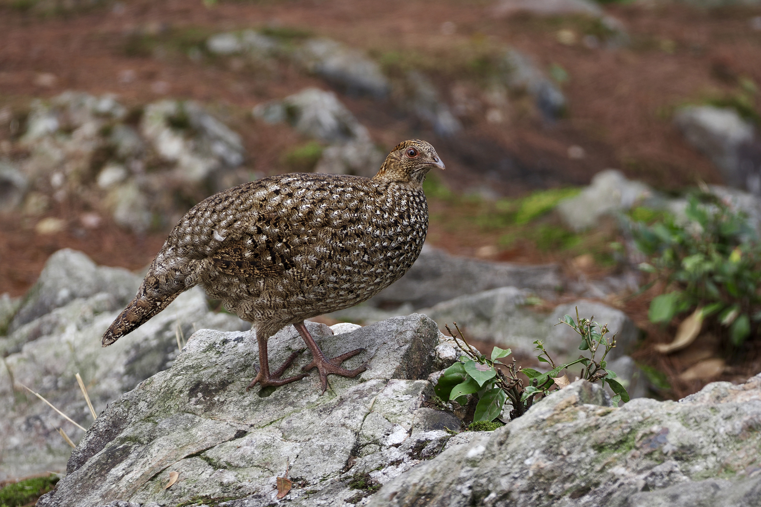 ボルネオ島の固有種であるキジの仲間で、日中でも暗い原生林の林床を歩き回っていました。こうした暗い環境では、撮影はスローシャッターになりがちです。低速シャッターでも強力な手ぶれ補正のおかげで、手持ちでもブレの少ないシャープな写真を撮ることができました。さらに、木に体を添えるなどの工夫をすることで、よりシャッタースピードを落とすことも可能です。