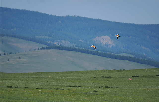 遠くに丘陵を望む平原を飛ぶ、アカツクシガモのペアを見つけました。風景のスケールが大きく、どのような被写体でも絵になる環境です。日本では、数少ない冬鳥として記録されています。