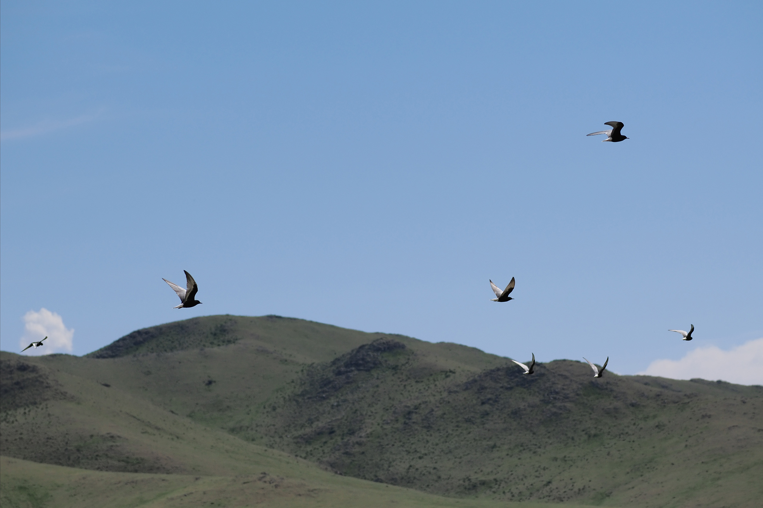 翼が白く体が黒い、美しい淡水性のアジサシの仲間です。日本でも渡りの季節に見られることがありますが、これほどの数が見られる機会はめったにありません。雄大な風景の中を群れで飛ぶ様子を、ズームレンズのワイド端を使って広角気味に撮影しました。