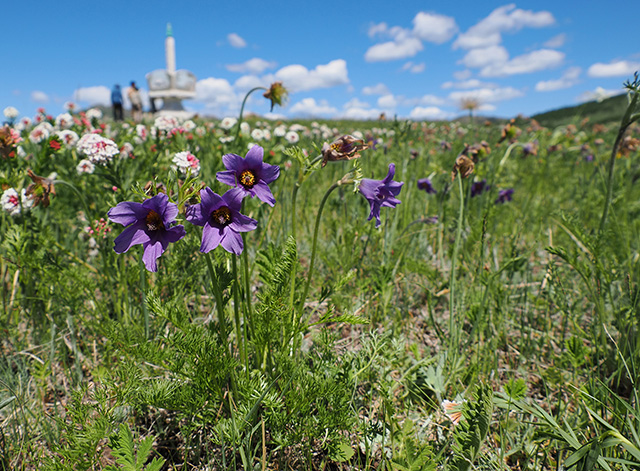 モンゴルでは、遅い春の訪れとともに草原の草花が一斉に開花します。鳥を目的に訪れていても、こうした植物を観察するのも楽しみのひとつです。サブレンズを携行すれば、より多様な表現が可能になります。このような構図では、バリアングルモニターを活用することで、地面に寝そべることなく撮影できます。