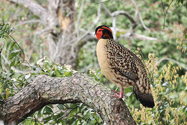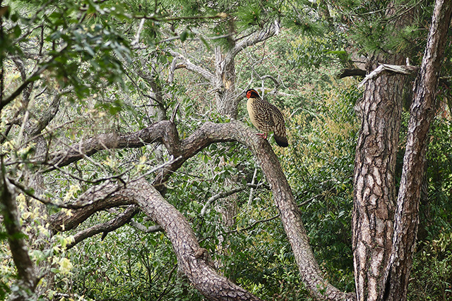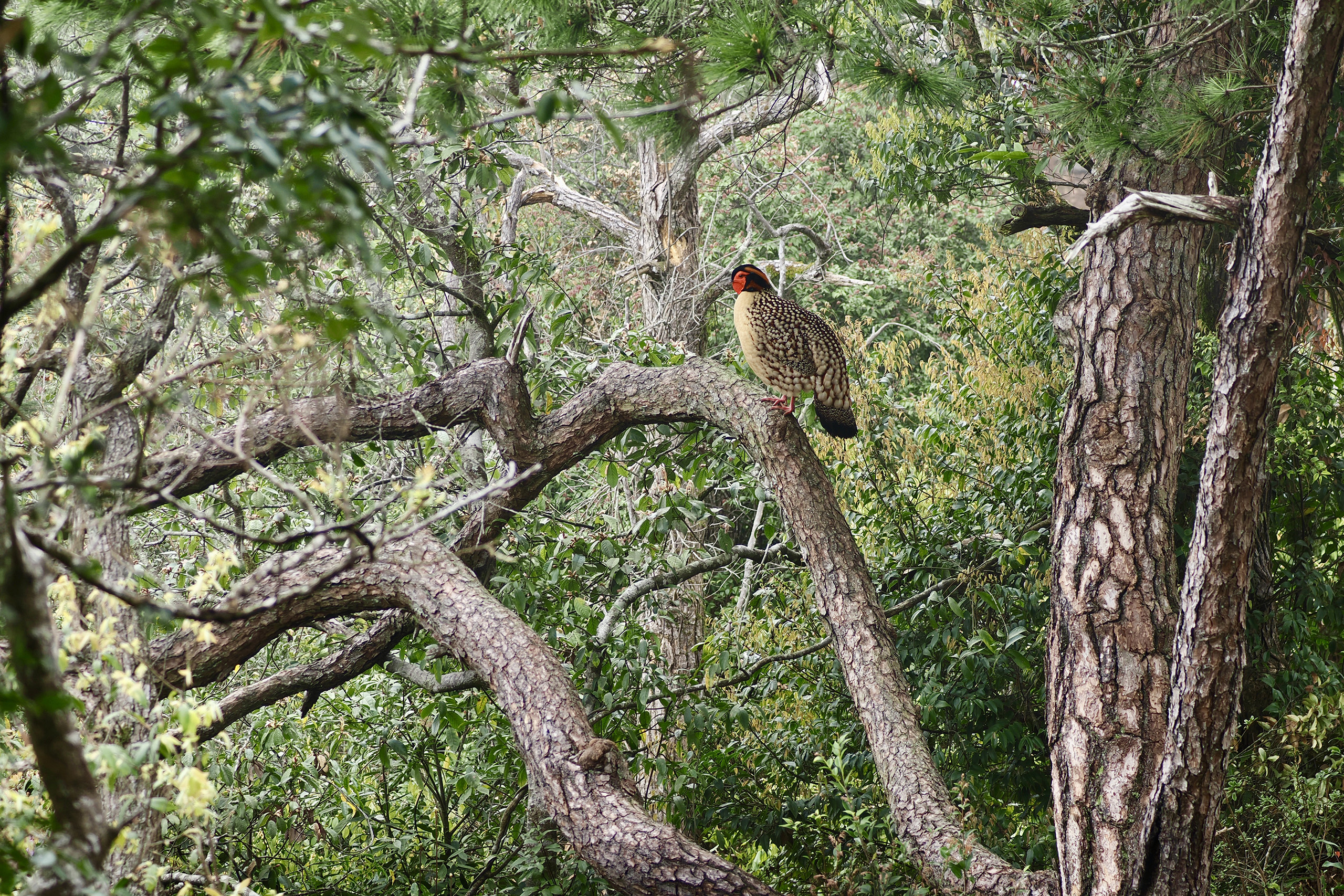 常緑広葉樹と松が混在する岩場の多い低山には、ジュケイという中型のキジが生息しています。山頂から延びる尾根を立体的に利用して生活しており、樹上に上がることも少なくありません。この雄は、すぐ下の藪にいる雌の様子をうかがうため、樹上でぴたりと動きを止めました。