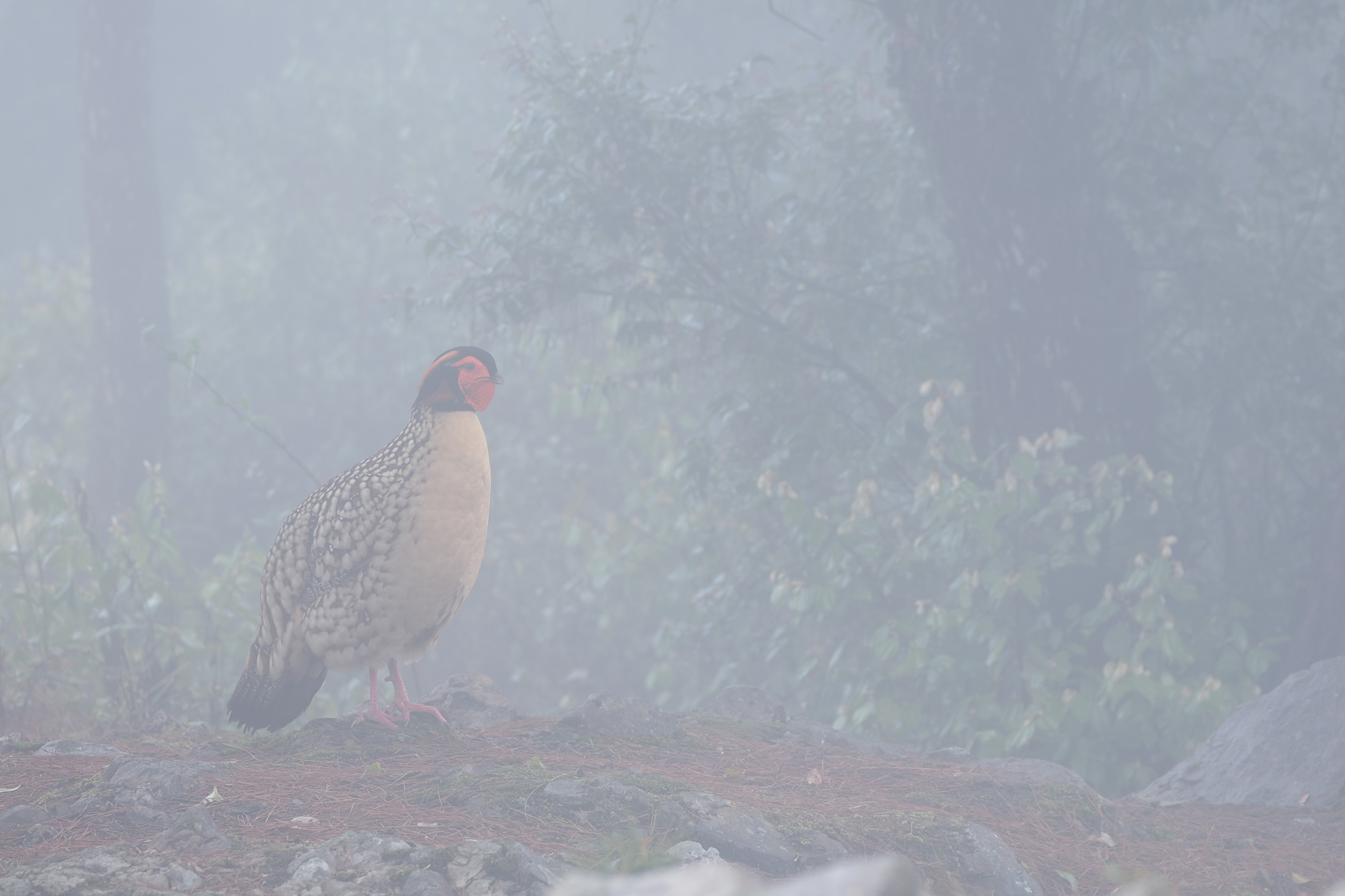 雨が降ると、山地はたちまち霧に包まれます。視界がほとんど利かないほどの濃霧となったため、試しに撮影してみました。これほどの濃霧の中でも、AI被写体認識AFの「鳥モード」は鳥の顔にピントを合わせてくれて驚きました。